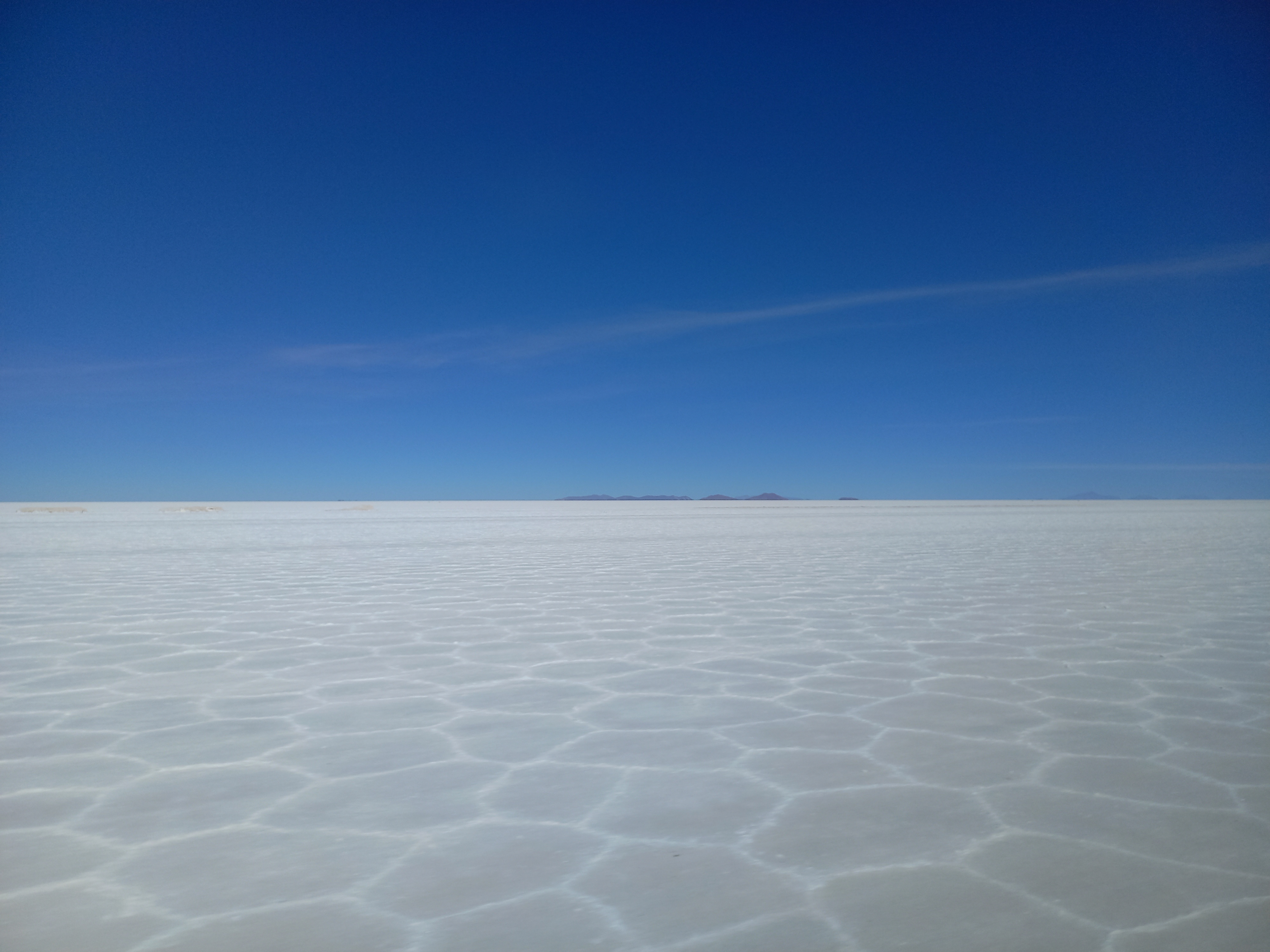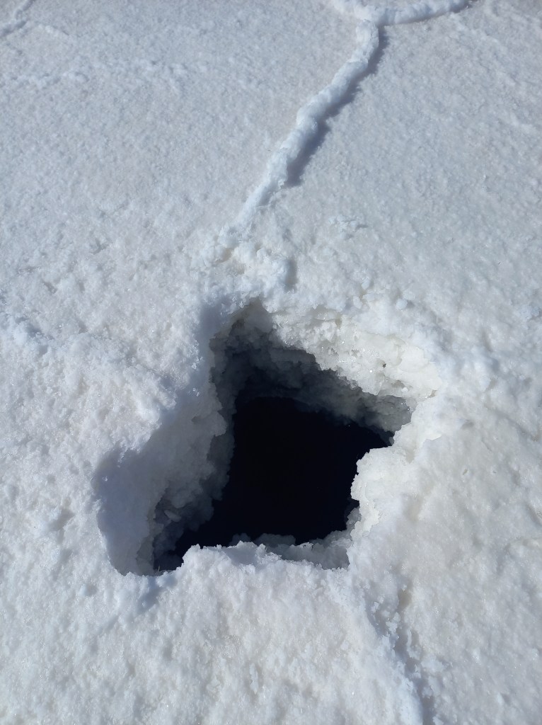 Nach ein bisschen sprudelndem Quellwasser, dass sich seinen Weg an die Oberfläche bahnt, sind wir nun auf den Weg zu den „Hexagonen“ im Salz. Die typischen, vom Wind geschaffenen Muster gelten als der Touristenhotspot schlechthin. Das gute bei der größten Salzwüste der Erde: Fast überall scheint es so, als wäre man ganz allein unterwegs.