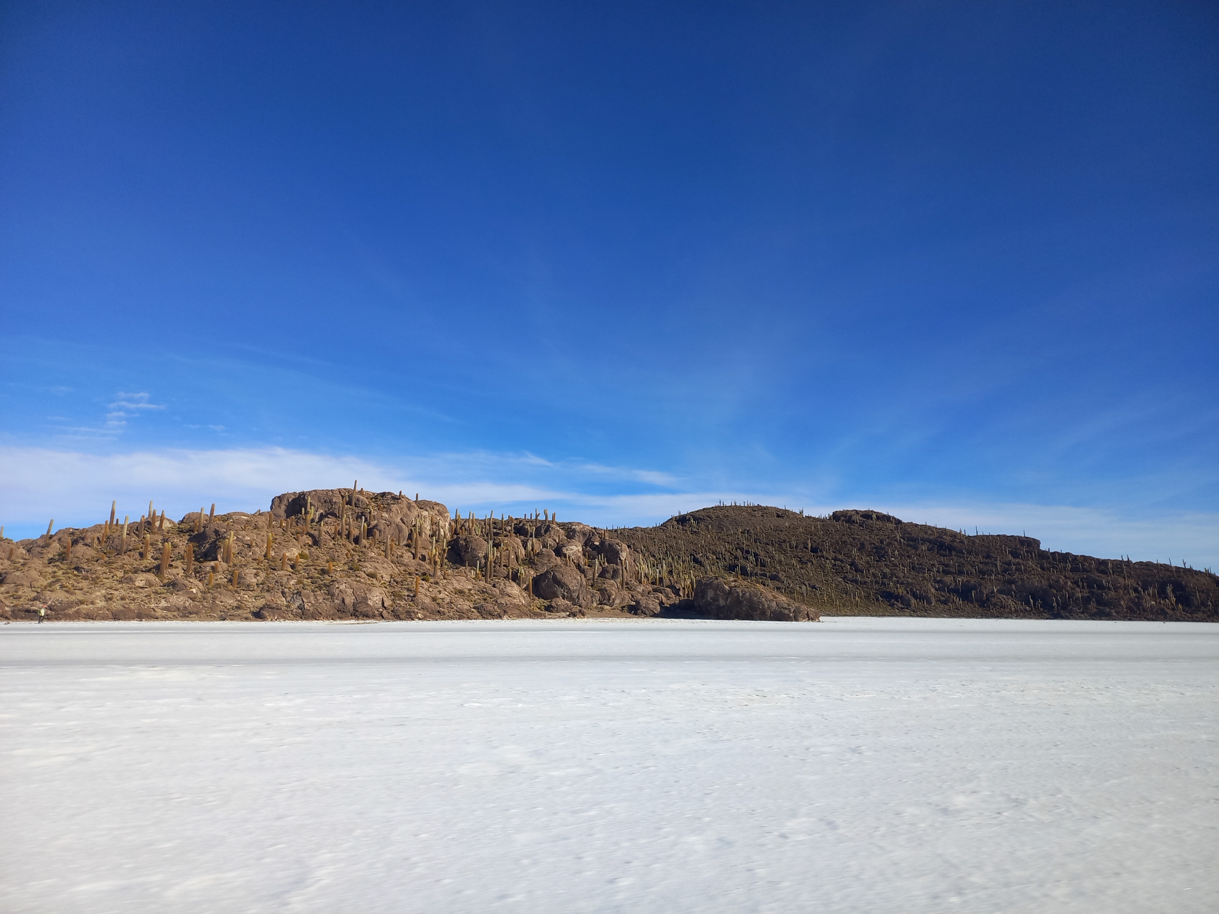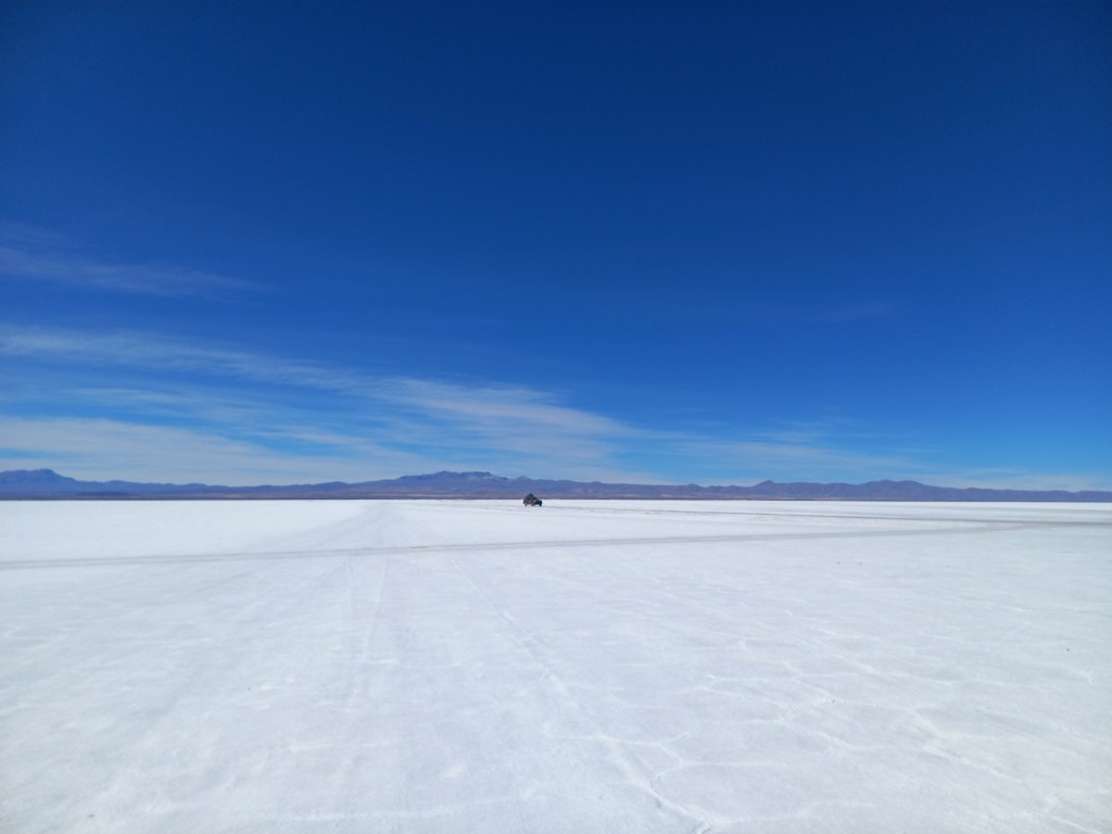 Auf ca. 10.000 km2 findet sich hier Salz in seichten Lagunen, zwischen Kakteeninseln und in der bekanntesten Form: Als feste, unendlich weite Salzebene, die nicht nur aufgrund des Panoramas den Touristen den Atem raubt. Da wir uns schon ein paar Tage in La Paz und Sucre über 3.000 m aufgehalten haben, beeinflusst uns die Höhe wenig. Andere Reisende sitzen hingegen mit einer Tasse Cocatee im Aufenthaltsraum des Hostels und warten darauf, dass die Übelkeit und Kopfschmerzen verschwinden.