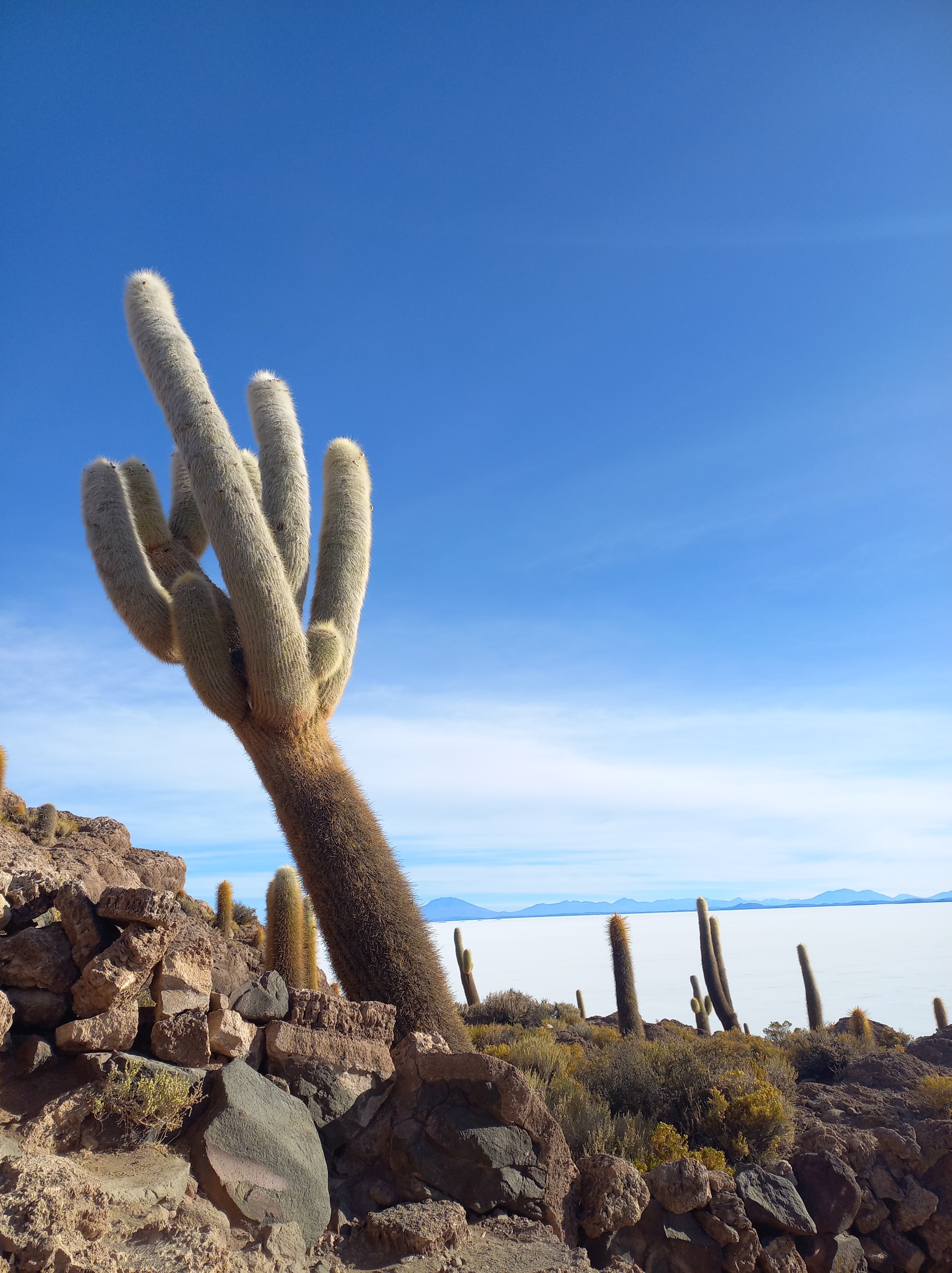 Die Zeit bis zum Sonnenuntergang wird noch fleißig mit einem Besuch des Salzhotels und der Kakteeninsel genutzt, die sich wie ein Trugbild im gleißenden Licht des Salars erhebt. Trotz der Höhe werden wir auf den „Gipfel“ der Insel hochgeschickt und erklimmen zwischen US-Amerikanern in high-tech Trekkingausstattung, einer mindermotivierten Jugendgruppe und unzähligen Kakteen, die braunen Felsen.