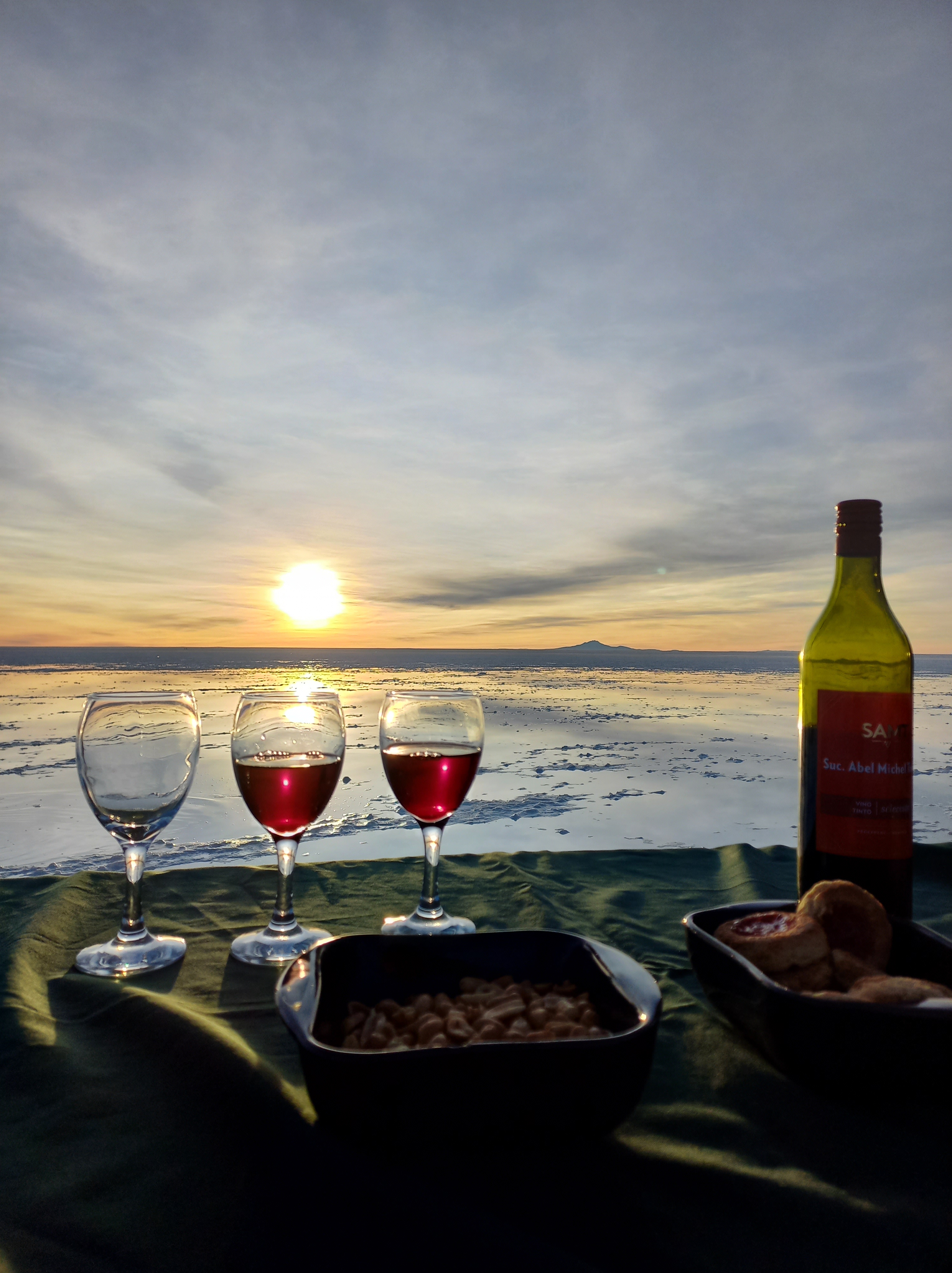 Dieser Effekt war bei uns trotz Trockenzeit vorhanden und so konnten wir zusammen mit unserer Reisegruppe mit Gummistiefeln an den Füßen einen gemütlichen Wein trinken, bevor wir Bekanntschaft mit den kalten Temperaturen der eisigen Nächte auf dem Salar machten.