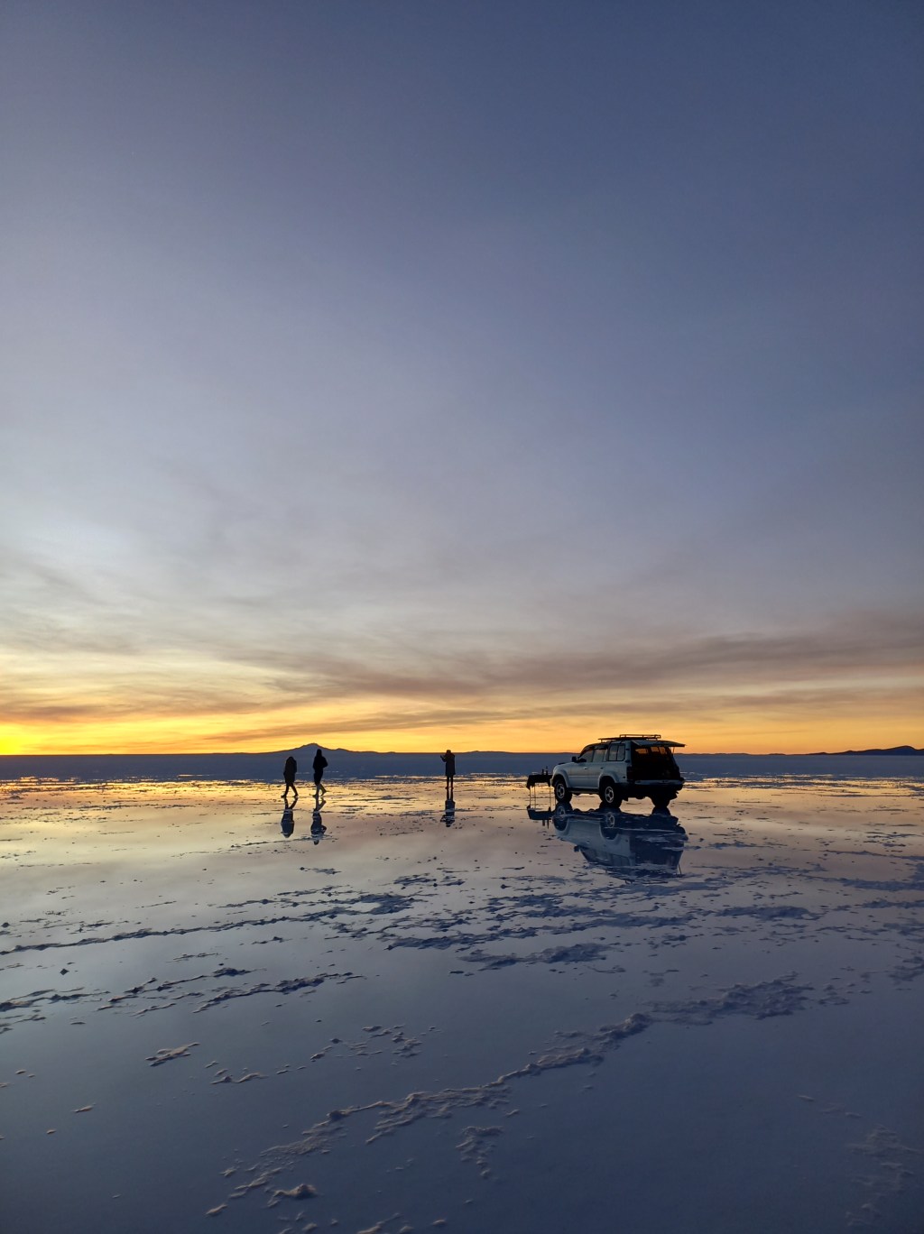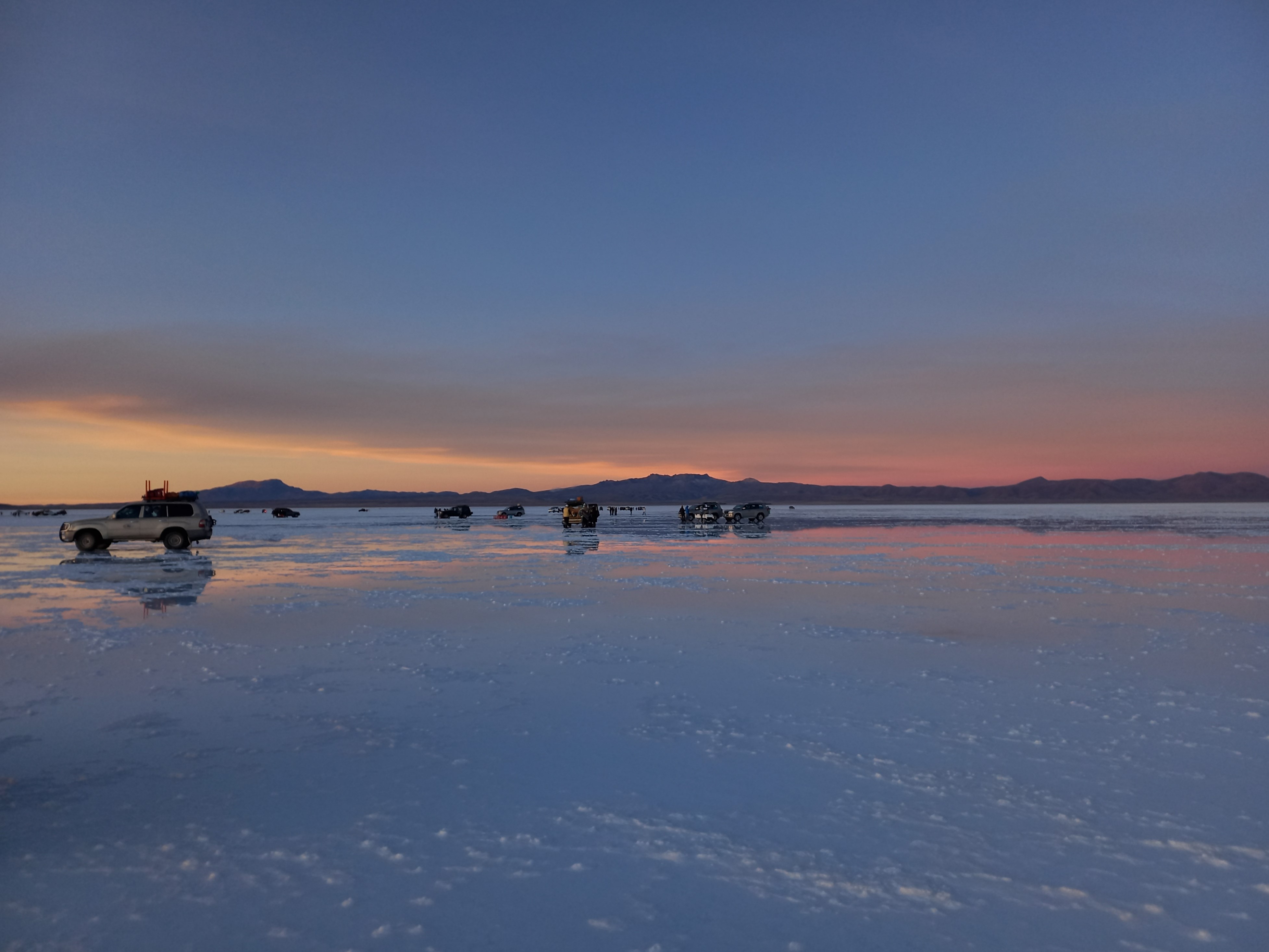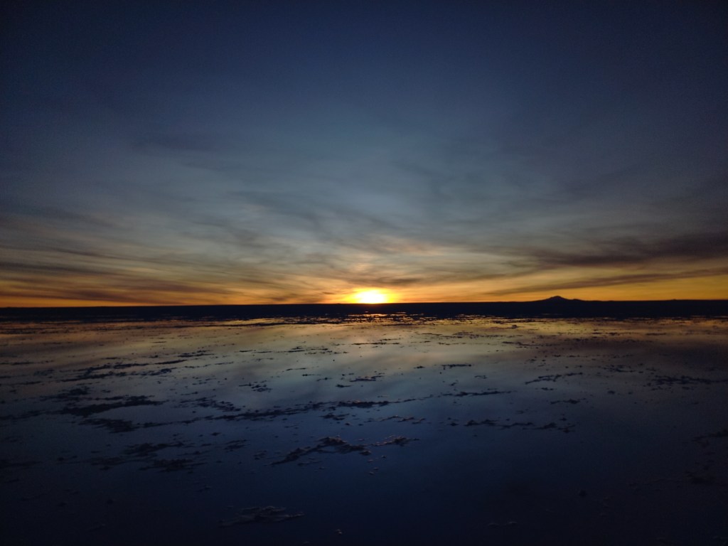 Unten beim Jeep angekommen, geht die Fahrt zum eigentlichen Highlight des Tages: Der Sonnenuntergang am „espejo del mundo“. Dieser Spiegel der Welt ist besonders im Sommer (Dezember, Januar, Februar) zu Regenzeit am beeindruckendsten. Dann sammelt sich das Wasser über dem Salz und bildet eine dünne Schicht, die die untergehende Sonne im wohl größten und lebendigsten Landschaftsgemälde spiegelt.