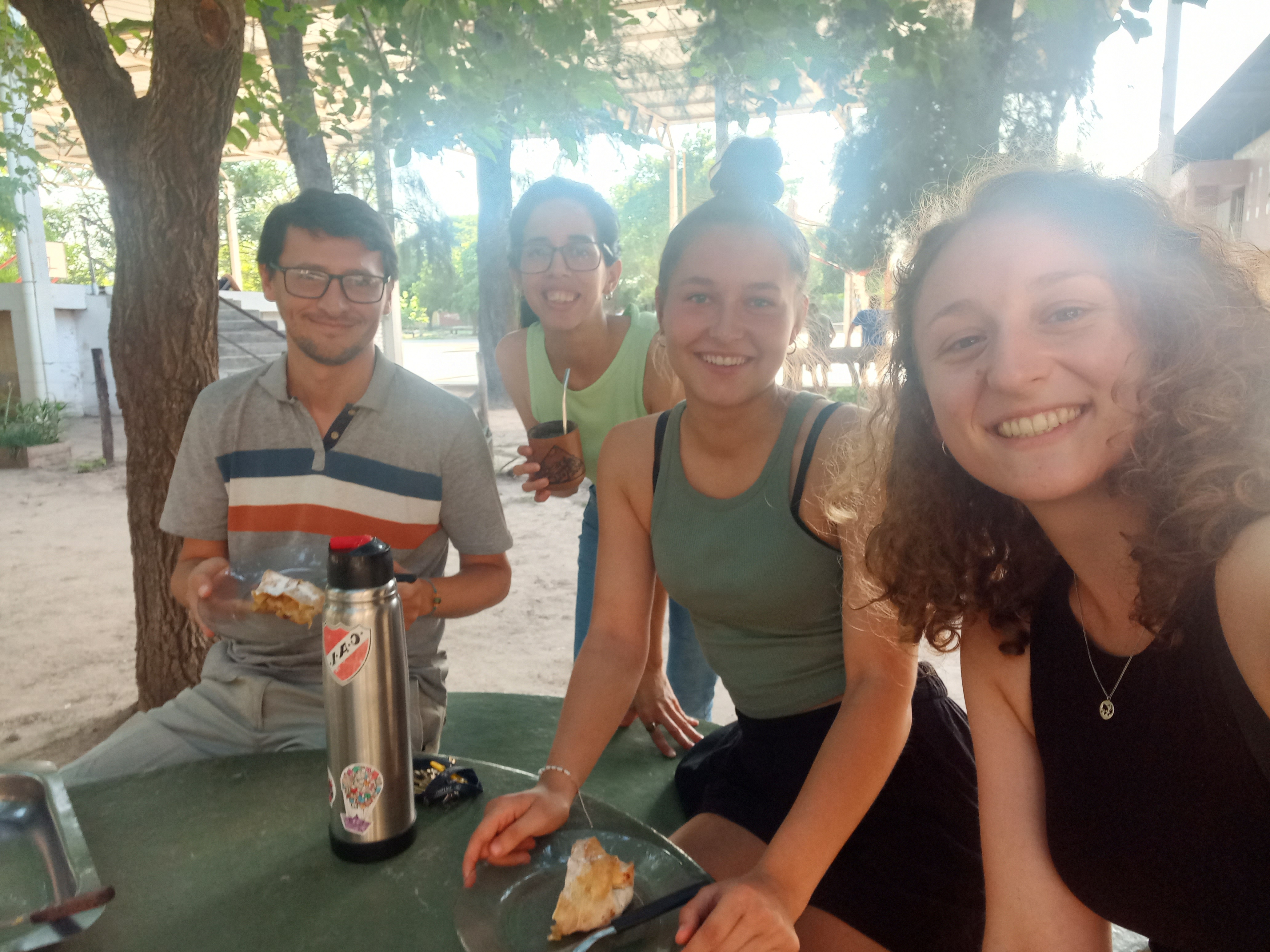 Kleine Randbemerkung: Meine Reise nach Santiago sollte eigentlich entspannt werden, da ich zur Abwechslung mal den Flieger nehmen wollte statt der langen Busfahrt von 14 Stunden. Der kurzfristige Flugausfall machte mir dann leider einen Strich durch die Rechnung, weshalb der Bus (2.v.links) dann doch herhalten musste. Zur Abschiedsfeier gabs dann aber im Oratorio was ganz Feines: Apfelstrudel (3. v. l.) und natürlich viel Mate (4. v. l.)!
